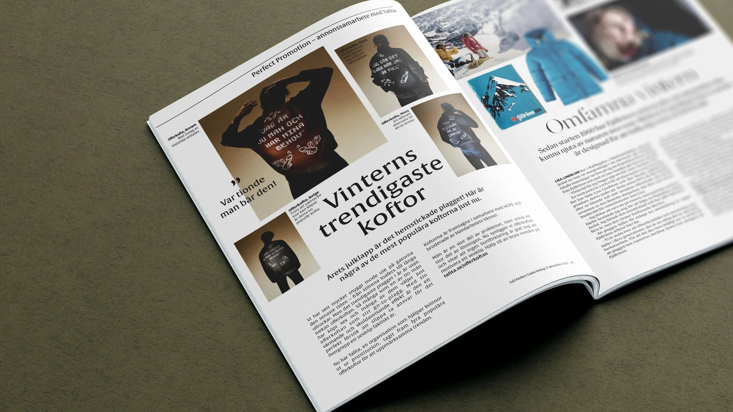 En av tio män i Sverige har köpt sex. En trend som inte ser ut att minska. Vi lyfte fram problemet i rampljuset, genom att förvandla männens vanligaste ursäkter och snyfthistorier till en fysisk kollektion av offerkoftor. Plaggen togs fram i samarbete med HOPE Sthlm och syntes i skyltfönster, utomhus, digitalt, mm. Som avslutning auktionerade vi ut en av koftorna på Tradera, där vinsten oavkortat gick till Talitas arbete. Var tredje svensk såg kampanjen och donationsintäkter ökade med 177%. Men kanske viktigast av allt, 55% av män blev mer engagerade i frågan i samband med kampanjen.